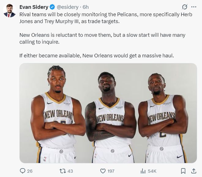 10月4日,北京时间,NBA记者Evan Steeley报告说,许多竞争对手密切监视了鹈鹕,尤其是Herbert Jones和Trey Murphy,两只翅膀。鹈鹕还没有准备好到目前为止交换它们,但是如果新季节开始差并接到许多咨询电话,那么这两个人中的任何一个都可以在进入贸易市场时获得慷慨的奖励。实际上,几个小时前,赫伯特·琼斯(Herbert Jones)只是被宣布应对脚踝受伤。 [今年夏天,琼斯只达到了与鹈鹕合同的三年,6800万份早期续签。该合同将在五年内将琼斯与鹈鹕的合同的总成本提高到9700万美元,并包括2029-30赛季的球员选择。他于今年2月进行了右肩维修操作,然后偿还了这段时间。上个赛季,他只打了20场比赛,平均为10.2分,3.9个篮板,3.2帮助,1.85抢劫,0.45个盖帽,投篮命中率为44%,三分命中率为31%。数据还撤出了一定程度。洛杉矶湖人强调国防问题。湖人媒体希望该团队交易获得这一防御部门。里夫斯(Reeves)和哈希穆拉(Hachimura AI)并不是防守球员,因此这两个人之一将是讨价还价的筹码。湖人媒体提出了一项派出哈希村的计划,因为要获得Onejones的防守球员,湖人只能牺牲一个不受保护的第一轮选秀权和第一轮交易所。他的计划是让湖人在2028年在2031年受到保护的第一轮选秀权,并在2030年获得了琼斯 +第二回合选秀权。这笔交易等同于获得两个首选选秀权,湖人表现出最大的诚实。这样,琼斯就可以发挥首发第三名,而在防守智能中最好的初学者,Doncic,J詹姆斯和艾顿。