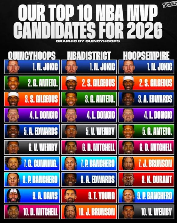 近日,美媒《Quincy Hoops》、《NBA District》、《Hoops Empire》近日评选出25-26赛季常规MVP前十名名单。这三大美国媒体心目中的前十名排名各不相同。不过,即将41岁的勒布朗已经不在其中,37岁的库里也将别无选择。 昆西圈十大MVP候选人:1.约基奇、2.扬尼斯、3.亚历山大、4.东契奇、5.爱德华兹、6.维纳南亚马、7.2.亚历山大、3.扬尼斯、4.东契奇、5.文巴亚马、 6. 米切尔,7.班科罗,8.爱德华兹,9.特雷·杨,10.布鲁恩森;篮球帝国前十候选人:1.约基奇、2.亚历山大、3.爱德华兹、4.东契奇、5.扬尼斯、6.米切尔、7.布鲁恩森、8.杜兰特、9.班凯罗、10.文班亚玛。美国三大媒体都将东契奇选在第四位。东契奇在称重体重后依然未能给美国媒体留下深刻印象。这与湖人队的阵容深度有关。现在可以看到,湖人队在没有东契奇和詹姆斯的情况下,依然很弱。东契奇被困在团队记录中。 40岁的詹姆斯上个赛季排名全秒球队 + MVP的第六名,詹姆斯在20年前排名第六的MVP投票中排名第六。但是,美国三大媒体将41岁的勒布朗排除在前十名MVP中。詹姆斯真的可以像悬崖一样倒下吗?篮球帝国将杜兰特(Durant)排在第八位,他们也有唯一选择KD的球队。杜兰特的个人数据平均每场25+5+5。考虑到火箭队的记录可能会在西部大会的前三名中持续下去,因此杜兰特(Durant)进入前十名MVP候选人似乎并没有重大问题。咖喱很难进入前十名MVP。如果他的团队的笔记或数据的稳定性是一个巨大的问号。这个简短的阵容和旧的阵容真的可以在西部会议上是一支强大的球队吗?