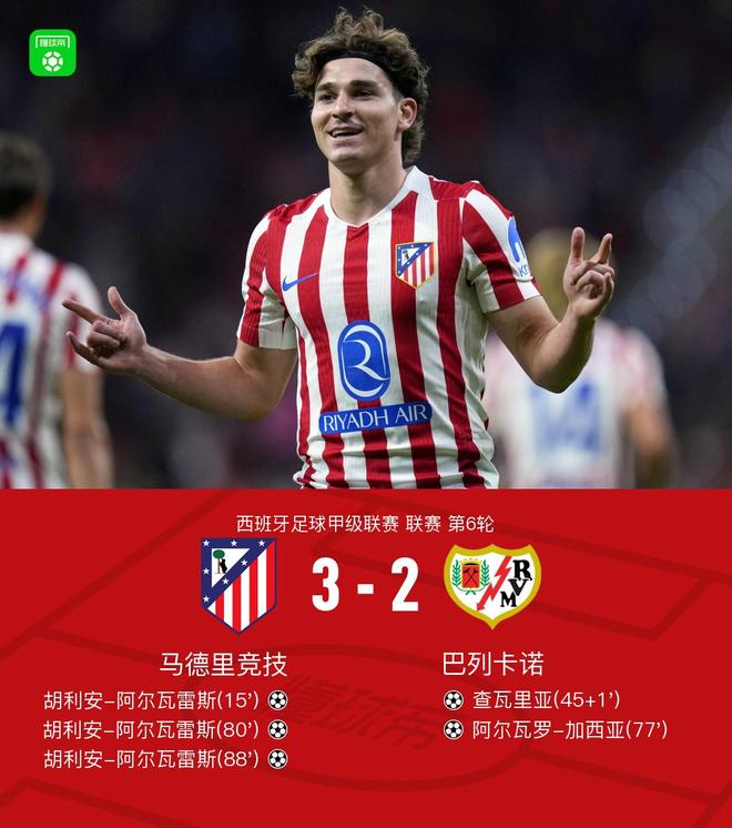 9月25日,在北京时代,第六个西班牙足球联赛举行,马德里的田径马德里面对瓦莱卡诺。在上半场,Lorent帮助Alvarez得分了,Chavarlia赢得了世界的超级浪潮。下半场,加西亚刚刚通过了守门员,将球推到了网上。 Simeone JR被保存,Alvarez完成了双击均衡。 Simeone JR将球越过球门并击中了横杆。阿尔瓦雷斯(Alvarez)射门得分,并盖了一顶帽子以完成最后的杀戮。马德里竞技以3-2击败了瓦莱卡诺。在主赛事的15分钟内,Llorente进行了十字架,Alvarez攻入了进球!马德里竞技在第45分钟的暴力美学中1-0 Vallecano!查瓦里亚(Chavaria)在超级世界浪潮(Super World Wave)和马德里竞技(Atletico Madrid)的第77分钟1-1瓦利卡诺(Madred)得分,倒挂!加西亚与守门员曼联曼联,将球推到了网上。马德里竞技1-2瓦莱卡诺在80分钟内快速轻松! Simeone Jr保存头球和阿尔瓦雷斯(Alvarez)在第88分钟两次以果断的谋杀率两次得分!阿尔瓦雷斯(Alvarez)得分很长,盖了帽子。马德里竞技3-2瓦莱卡诺在一个非常愉快的时刻。双方的球员进入球场。游戏将在11分钟开始。格里兹曼(Griezmann)运球到罚球区并推了球。巴塔利亚将球挡住了15分钟。洛伦特(Llorente)十字架,阿尔瓦雷斯(Alvarez)是凌空!马德里竞技在第22分钟1-0 Vallecano。 Paranor通过Oblak距离十字架不远。 Legena停止了球并在35分钟内射击。佩雷斯(Perez)十字架。德国人得分,无法获得他身体平衡的第39分钟。格里兹曼从机翼上划了一个十字架。阿尔瓦雷斯从43分钟开始越过十字架。瓦莱卡诺(Vallecano)发挥了一场战术踢,然后在口袋里开枪。 Oblak将球挡住了45分钟。暴力美学! Chavarya在超级世界浪潮中得分。D在双方之间造成了冲突。 Kok的脖子为黄色52分钟,Parathon抓住了对手的间隙错误,并直截了当。在666分钟内,Oblak解决了这场危机,Simeone JR获得了很长的通行证,并摧毁了为投篮做准备的点球场所,但被摧毁了。 Batalia在722分钟内受到袭击和清除,她还想在世界上挥手吗? Baliu的远程射击没有在77分钟内倒置!加西亚与守门员曼联曼联,将球推到了网上。马德里竞技1-2瓦莱卡诺在80分钟内快速轻松! Simeone JR挽救了一个头球,Alvarez在第82分钟以2-2得分,他的运气太糟糕了! Simeone Jr近距离射门,并在第88分钟击中了横杆,最后杀死了!阿尔瓦雷斯(Alvarez