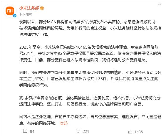 9月26日中午,小米集团法律部门的官方微博宣布,很长一段时间以来,一些MCN机构和互联网黑水部队继续发表虚假评论,恶意谣言和破坏公司,并削弱了清晰明确的在线意见。为了保护公司的合法权利和利益,小米法律事务一直坚持根据法律促进合法权利保护。小米说,从2025年到现在,小米法律事务完成了对16,465个公众舆论提示的法律评估,专注于监视231个在线帐户,并针对这些恶意违规账户中的92个提起了平民诉讼,并犯下了相关的法律违规法律违规行为。目前,某些案件进入法院测试阶段,该案的发展将及时表示。同时,它也关注某些小米汽车的情况纳德无缘无故地发动了网络的攻击。小米法律事务通过保护其权利帮助了一些汽车。目前,总共有35个汽车保护要求已经开始。将来,这将继续关注这种在线漏洞。声明上写道:“互联网不是一个无法的地方,言论自由也具有界限。请尊重事实,理性地说话,并共同创建一个健康而有序的网络环境。”昨天(TH -25),小米集团举行了一个新的秋季产品发布会,并正式推出了Thexiaomi 17系列,小米平板电脑8系和许多新的家庭技术项目。同时,小米的创始人,董事长兼首席执行官Lei Jun将举行他的第六届年度演讲。活动结束后,Lei Jun还提到“小米汽车在与Observer.com交谈时都找到了黑水军”。 25日傍晚,小米创始人,董事长兼首席执行官莱·朱尼(Lei Jun)向媒体讲话。 observer.com的声音不友好,针对那些拥有的人小米汽车在互联网上,一些小米汽车拥有的汽车也攻击了强烈的攻击。 Lei Jun说,从新闻稿中,小米汽车已成为“整个网络中被黑客入侵的品牌之一”。他说:“目前,六名部长和委员会共同努力打破黑水大军和黑人公共关系。我们双方支持这一切。市场法规和OT部门最近共同发出了“为汽车行业网络进行特别审查的通知”和DECI为全国汽车行业网络的混乱做出为期三个月的特别纠正措施。据报道,这项特殊的更正运动将着重于纠正在线骚乱,例如非法收入,夸张和放错了宣传,恶意诽谤 - 武器和攻击,提高处理车辆公司中在线干扰的质量和效率,鼓励构成营销和宣传的开发,创造良好的意见环境的企业,并培养良好的汽车行业开发。本文是observer.com的独家文章,未经许可就不得复制。
