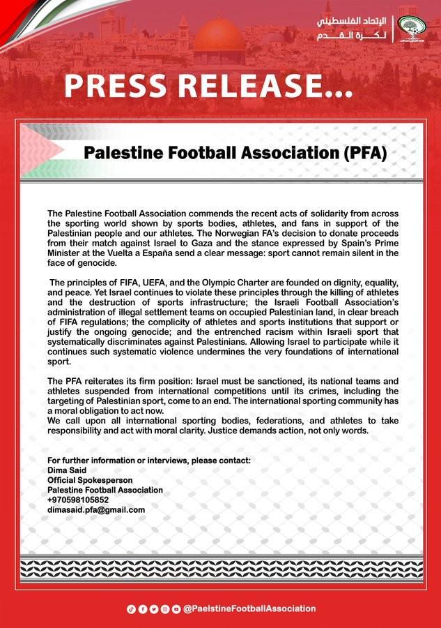 9月19日上午,北京时代,巴勒斯坦足球协会正式发布了一条公告,呼吁禁止以色列队。巴勒斯坦足球协会已正式宣布:巴勒斯坦足球协会赞扬了近年来体育行业各种体育组织,运动员和球迷所表现出的团结精神,以支持巴勒斯坦公民和运动员。挪威足球协会决定向以色列提供收益到加沙的收益,西班牙总理在游览西方的立场发出了一个明显的信号,表明体育社区无法留在种族灭绝的面前。 FIFA,UEFA和《奥运会宪章》的原则是基于尊严,平等与和平的,但是,以色列继续违反这些原则,包括杀害Atleta和对体育基础设施的破坏。以色列足球协会负责监管巴勒斯坦领土的非法团队,明显违反了FIFA法规,包括串谋支持或捍卫正在进行的种族灭绝的运动员和体育机构。以色列体育社区对巴勒斯坦人具有深层的种族主义和系统的歧视,这使以色列得以参加,而这种系统的暴力行为的持续实施却损害了国际体育的基础。巴勒斯坦足球协会重申了其稳定的立场:必须对以色列进行惩罚,必须禁止国家队和运动员参加国际比赛,包括在巴勒斯坦体育比赛中进行的战斗,结束了,国际体育社区具有立即行动的道德责任。我们呼吁所有国际体育机构,联合会和运动员以道德理解承担责任并采取行动。正义需要采取行动,而不是空洞的对话。