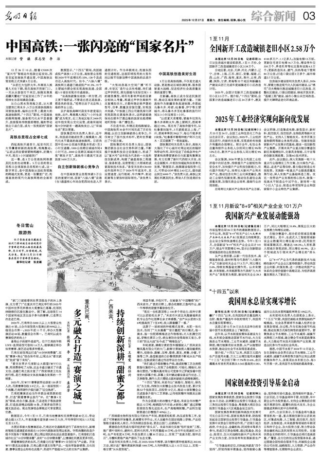 本报北京12月26日电(记者卢元珍)国家市场监管总局26日发布的最新数据显示,今年以来,我国“8+9”相关产业(8个新兴产业、9个未来产业)发展动能不断释放,企业设立保持快速增长态势。今年1-11月,全国共设立“8+9”相关工业企业101万户,比去年同期增长9%,显示出创新领域创业投资的旺盛热情。分行业类别看,以新一代信息技术、制造高端装备、新材料等为代表的“八个新兴产业”共新设相关企业77.5万户,同比增长2.6%,继续发挥关键支撑作用。 “九大产业”以未来健康、未来智能、未来能源等为代表的“未来”表现较好,相关新成立公司28.3万家,同比大幅增长35.8%,展现出巨大的发展潜力和增长动力。细分赛道上,一些前沿领域呈现爆发式增长。其中,生成人工智能领域新成立公司数量同比增长超过29倍;民航领域紧随其后,增速为108.3%;人形机器人领域也表现活跃,年均增长48.9%,成为引领丰收产业增长的“排头兵”,以“8+9”产业为代表的高新技术和战略性新兴工业企业比重持续提升,带动我国企业做新做强,进一步推动我国产业体系迈向中高端。融入全球价值链,为经济高质量发展注入新活力。